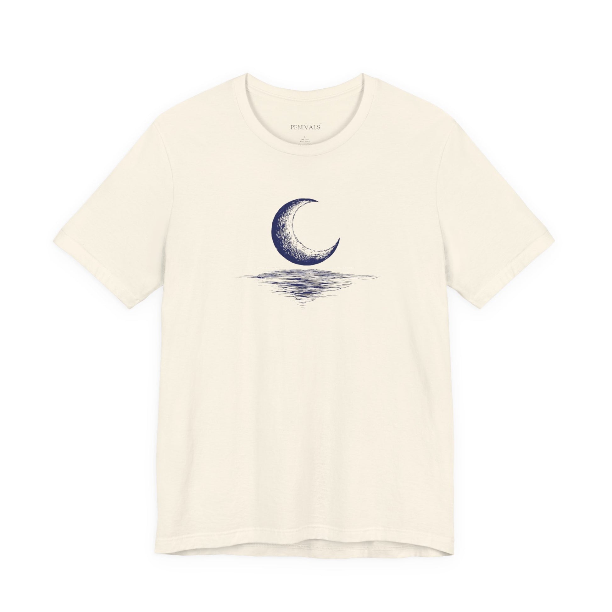 A waning crescent moon hovering above still water. Original navy ink illustration printed on Bella+Canvas 3001 premium cotton. Soft, lightweight, true to size.